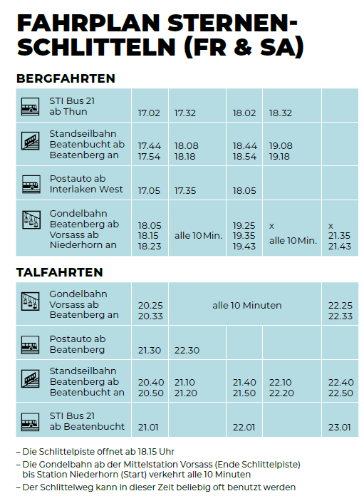 - Veuillez vous informer sur les horaires de la luge en étoile pour connaître les horaires du train (voir horaire ci-dessous).